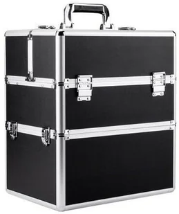 Kuferek kosmetyczny XXL dwuczęściowy na lampę i frezarkę czarny gładki srebrne okucia (bez kratki, bez paska) Funkcjonalny i atrakcyjny kuferek kosmetyczny/fryzjerski idealny dla stylistek paznokci, kosmetyczek, wizażystek pracujących w terenie lub do przechowywania kosmetyków w domu. Solidne wykonany, rozkładany oraz optymalnie dobrany rozmiar kuferka pozwala na bezproblemowe włożenie do środka pełnowymiarowej lampy UV oraz LED. Kuferek otwierany dwustronnie posiada 2 rozsuwane półki na drobne przybory, jak lakiery hybrydowe, pędzle, kosmetyki niewielkich gabarytów i sporych rozmiarów. Solidne wykonany, rozkładany oraz optymalnie dobrany rozmiar kuferka pozwala na bezproblemowe włożenie do środka pełnowymiarowej lampy UV, oraz LED. Kuferek otwierany dwustronnie posiada rozsuwane półki, oraz zabezpieczenie w postaci dwóch zamków zamykanych na kluczyk.
