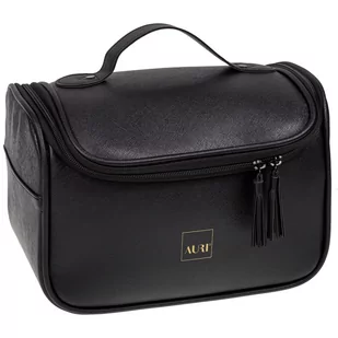 Kuferek marki AURI. Wykonany został z wysokiej jakości eko-skóry w czarnym kolorze. Przeznaczony do przechowywania wszelkich akcesoriów do makijażu i kosmetyków. Posiada jedną wielką komorę z trzema gumkowymi uchwytami na akcesoria oraz podwójną kieszonkę na wszelkiego rodzaju drobiazgi. Pod pokrywką zamykająca znajduje się lusterko.