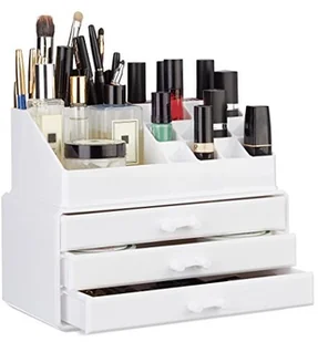 Organizer do makijażu w szczegółach - Zestaw 2 pojedynczych części - Wymiary wys. x szer. x gł. : ok. 19 x 23,5 x 14 cm - Liczba półek: 19 - Waga: ok. 1,2 kg - Materiał: akryl - Różne kolory Organizer na kosmetyki z wieloma półkami - 3x szuflada wys. x szer. x gł. : ok. 3 x 21 x 12,5 cm - 1x duża półka wys.