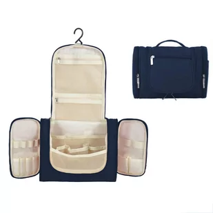 granatowy Pojemna, praktyczna, wygodna kosmetyczka. Haczyk do zawieszenia plus wygodny uchwyt do przenoszenia. Nieprzemakalny materiał kosmetyczki. Liczne przegródki, kieszonki i zakładki Zamykana na zamek błyskawiczny idealna na wakacje, delegację, w walizce i łazience. Na wyjeździe i codziennie w domu.