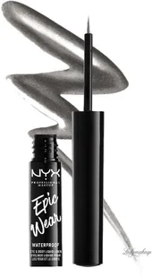 Epic Wear Mettalic - Eye & Body Liquid Liner marki NYX Professional Makeup. Liner do oczu i ciała. Posiada specjalną wodoodporną formułę, dzięki czemu sprawdzi się w każdych warunkach pogodowych, a także utrzymuje się na skórze przez 36 godzin. Szybko zasycha, nie rozmazuje się i zapewnia niezwykle trwały efekt o metalicznym wykończeniu. Wyposażony został w specjalny precyzyjny aplikator w pędzelku, który pozwala na wyrysowanie idealnej kreski o dowolnym kształcie i grubości.