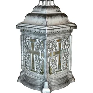 Znicz szklany w plastikowej obudowie kapliczka biały posrebrzany 26 cm krzyż ADMIT