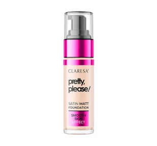 Pretty, Please! Satin Matt Foundation marki Claresa. Podkład do twarzy. Posiada lekką, kremową konsystencję, która pozwala skórze oddychać. Doskonale maskuje niedoskonałości oraz dobrze wyrównuje koloryt. Pozwala osiągnąć efekt średniego krycia, z możliwością budowania go do mocnego.