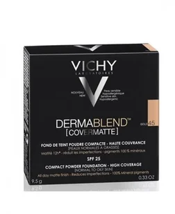 VICHY DERMABLEND COVERMATTE Puder w kompakcie 45 goldWskazania: Vichy Dermablend Covermatte puder w kompakcie w odcieniu 45 gold przeznaczony jest do jasnej karnacji i cery normalnej i tustej. Waciwoci: Vichy Dermablend Covermatte puder w kompakcie w odcieniu 45 gold swj kolor zawdzicza pigmentom w 100% mineralne. Formua pudru Dermablend o waciwociach silnie kryjcych pozwala na redukcj niedoskonaoci, bez efektu maski. Produkt zawiera kwas salicylowy, perlit oraz glukonian cynku, ktre minimalizuj nadmiar sebum i oferuje matowe wykoczenie makijau do 12 godzin.
