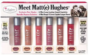 Meet Matt(e) Hughes - 6 Mini Long-Lasting Liquid Lipsticks - EXCLUSIVE NEW SHADES marki The Balm. Zestaw 6 pomadek. W jego skład wchodzą oryginalne odcienie: FAITHFUL, CHARISMATIC, BRILLIANT, AFFECTIONATE, RELIABLE, ROMANTIC. Szminki są dostępne w mini wersji, która zmieści się do każdej kopertówki czy kosmetyczki.