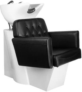 Stylowa myjnia fryzjerska. Bardzo komfortowa, idealnie pasująca do wnętrz eleganckich salonów. Kąt misy regulowany. Myjnia bardzo stabilna i solidna. Obicie z najwyższej jakości ekoskóry koloru czarnego, biała misa ceramiczna.