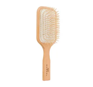 Szczotka do włosów marki GORGOL. Doskonale sprawdzi się do czesania, stylizowania oraz masażu skóry głowy. Drewniane szpilki, jak i rękojeść wykonane zostały z ekologicznego bukowego drewna, zaś poduszka pneumatyczna to w 100% naturalna guma, dzięki czemu produkt jest przyjazny dla środowiska i całkowicie biodegradowalny. Na wewnętrznej części rączki umieszczono logo producenta. Szczotkę można użytkować wraz z suszarką.