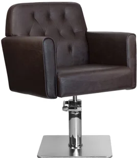 Stylowy fotel fryzjerski. Bardzo komfortowy, idealnie pasujący do wnętrz eleganckich salonów. Regulowany w płaszczyźnie pionowej. Bardzo stabilny i solidny. Obicie z najwyższej jakości ekoskóry koloru brązowego.