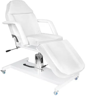 Fotel kosmetyczny hydrauliczny BASIC 210 biały na kółkach. WERSJA EUROPEJSKA! Fotel obrotowy z blokadą, podnoszony i opuszczany hydraulicznie z otworem w zagłówku, doskonale sprawdza się w kosmetyce, wizażu i masażu. Posiada wyjmowane podłokietniki i zaślepkę w zagłówku. Poszycie fotela łatwo zmywalne, wykonane z eko-skóry, spełniające rygorystyczne wymogi UE, estetyczne, niklowane elementy metalowe. Dodatkową zaletą są solidne, blokowane kółka dzieki którym z łatwością można przemieszczać fotel.