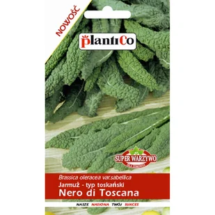 Nasiona warzyw PlantiCo. Jarmuż Nero di Toscana - Super warzywo - wyróżnia się wyjątkowo cennymi dla zdrowia właściwościami odżywczymi, nazywany inaczej czarną kapustą toskańską zaliczany do super warzyw ze względu na zawartość sulforanu - silnego przeciwutleniacza o działaniu przeciwnowotworowym, którego właściwości będą zachowane w obróbce na zimno i cieplnej do 76 stopni C przez 3-4 minuty. Zawiera karotenoidy i duże ilości witaminy A, B, C, K oraz potas, wapń, żelazo i jednocześnie bardzo mało kalorii. Częścią jadalną są długie, wąskie, pomarszczone liście, koloru ciemnozielonego. Smak łagodniejszy, słodszy od zwykłego jarmużu.