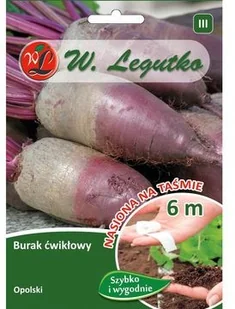 BURAK ĆWIKŁOWY Opolski W. Legutko 20g - Pierwsza polska odmiana buraka ćwikłowego o cylindrycznym kształcie korzenia, wyróżniająca się smakowitością i bardzo dobrze wybarwionym miąższem - Przydatny do bezpośredniego spożycia, przechowywania i przetwórstwa Wysiew: Wysiew do gruntu od kwietnia do końca czerwca, w rzędy co 30-50 cm, a na zagonach co 20-50 cm. Nasiona powinny padać w rzędzie co 3-5 cm. Grubość przykrycia 2-3 cm.