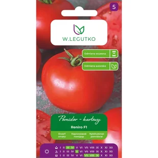 Pomidor gruntowy karłowy Reniro F1 to odmiana plenna, o dużych, mięsistych, czerwonych, kulistych i smacznych owocach odpornych na spękania.
