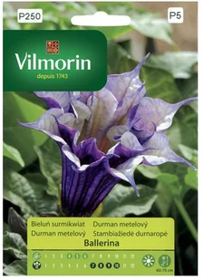 Bieluń surmikwiat Ballerina jest to niebywale atrakcyjna roślina cechująca się oryginalnym wyglądem. Jego kwiatostan składa się z regularnych zaostrzonych na końcach płatków które układają się w kształt przypominający trąbkę. Dodatkowo posiada intrygującą kolorystykę gdyż fioletowy na zewnątrz kwiat jest biały w środku.