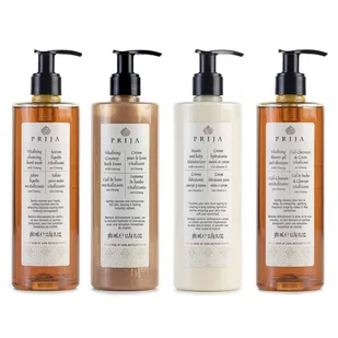 Zestaw kosmetyków PRIJA to hypoalergiczne produkty o delikatnym intrygującym i zmysłowym zapachu. Dzięki zastosowaniu wyciągów roślinnych posiadają właściwości regeneracyjne, odżywcze i aromaterapeutyczne. Ciepłe zapachy, naturalne kolory, zmysłowa konsystencja sprawią, że Twoja pielęgnacja będzie chwilą relaksu na najwyższym poziomie. Całkowicie wegańska formuła nada się dla każdego, a miłośnicy natury będą zadowoleni dzięki temu, że butelka oraz etykieta zostały wykonane z produktów z recyklingu. Zestaw składa się 1x380 ml płynu do kąpieli, 1x380 ml mydła w płynie, 1x380 ml kremu nawilżającego oraz 1x380 ml żelu pod prysznic.
