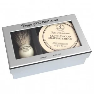 Zestaw upominkowy w eleganckiej szarej skrzynce Taylor of Old Bond Street, w którym znajduje się pędzel do golenia z włosiem z borsuka i krem do golenia o zapachu drzewa sandałowego. Pędzel został ręcznie wykonany z włosia borsuka w jakości pure badger. W przeciwieństwie do pędzli sztucznych zatrzymuje znacznie więcej wody i można z nim ubić sporo piany. Jednocześnie podczas nanoszenia delikatnie masuje skórę twarzy. Krem do golenia w praktycznym naczyniu, które służy również do wygodnego ubicia piany.