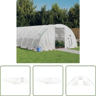 PE (polietylen), stal ocynkowanaWymiary: 24 x 4 x 2 m (dł. x szer. x wys.)Rozmiar okna (na sztukę): 40 x 40 cm (dł. x szer.)Rozmiar drzwi: 100 x 185 cm (szer. x wys.)Gęstość PE: 140 g/m²Z 2 zamkami błyskawicznymiWymagany montaż: