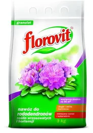 "Granulowany nawóz do rododendronów roślin wrzosowatych i hortensji marki Florovit 3 kg powstał z myślą o wszystkich pasjonatach ogrodnictwa ceniących sobie wygodę użytkowania oraz wysoką jakość produktów. Produkt przeznaczony jest do posypowego nawożenia rododendronów (różaneczniki i azalie) oraz roślin wrzosowatych. Skład nawozu jest odpowiednio dobrany do potrzeb pokarmowych wszystkich gatunków tych właśnie roślin, zapewniając równomierny zdrowy wzrost, obfite kwitnienie oraz intensywne wybarwienie kwiatów. Wysoka zawartość potasu zwiększa odporność na wymarzanie oraz wpływa na ogólny wygląd roślin. Dzięki specjalnie dobranej recepturze działa przez cały okres wegetacji.