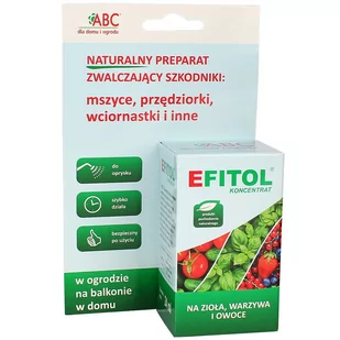 NATURALNY I BEZPIECZNY ŚRODEK NA MSZYCE, PRZĘDZIORKI, WCIORNASTKI I INNE ABC EFITOL KONCENTRAT 24 ML NA ZIOŁA, WARZYWA I OWOCE W OGRODZIE, NA BALKONIE, W DOMU produkt pochodzenia naturalnego zwalcza mszyce, przędziorki, wciornastki i inne szkodniki szybko działający, wydajny i skuteczny może być stosowany w obecności zwierząt bezpieczny po użyciu atest PZH/BT OPIS PRODUKTU ABC EFITOL KONCENTRAT NA ZIOŁA, WARZYWA I OWOCE jest preparatem zawierającym składniki pochodzenia naturalnego. Głównym składnikiem jest olej rydzowy pochodzący z Lnicznika siewnego (Camelia sativa). Produkt nie jest klasyfikowany jako niebezpieczny. Posiada szerokie spektrum działania - skutecznie ogranicza aktywność różnych gatunków roztoczy: szpecieli (Eriophyidae), różnopazurkowców (Tarsonemidae), przędziorków (Tetranychidae), pseudoprzędziorków (Tenuipalpidae) oraz drobnych szkodliwych owadów takich jak: