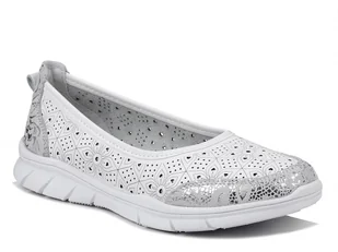 Miękka, skórzana wkładka zwiększa komfort użytkowania, a lekka konstrukcja sprawia, że buty niemal nie są wyczuwalne na stopie. Najważniejsze cechy modelu Skórzana, perforowana cholewka w białym kolorze Miękka skórzana wkładka Lekka i elastyczna podeszwa Kobiecy, uniwersalny fason Dzięki połączeniu estetyki i funkcjonalności wiosenne baleriny skórzane świetnie sprawdzą się zarówno do sukienek, jak i do spodni czy jeansów. To także doskonały wybór dla kobiet, które poszukują ażurowych balerin damskich – lekkich, przewiewnych i stylowych w każdej sytuacji. Rozmiarówka typowa - pasuje zazwyczaj noszony rozmiar.
