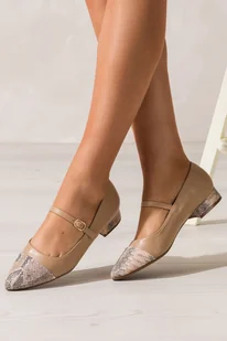 Beżowe baleriny damskie Mary Jane z paskiem na niskim obcasie klocku skórzana wkładka nosek z wzorem wężowym Casu ER24WX9-BE