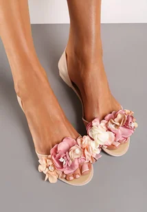 Beżowe Otwarte Balerinki z Aplikacją z Kwiatami Anlofi