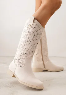 Beżowe Ażurowe Botki Kowbojki z Geometryczną Ozdobą Naeraste