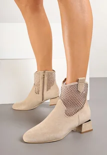 Beżowe Botki na Słupku Vices Ozdobione Siateczką na Cholewce Deovenna