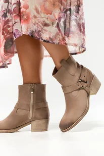 Beżowe botki skórzane damskie kowbojki na klocku z paskami i ozdobą PRODUKT POLSKI Casu 60477