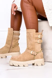 Beżowe botki workery ze złotym łańcuchem POLSKA SKÓRA Casu 9973-ARIA