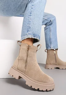 Beżowe Botki z Ozdobną Taśmą z Nadrukiem Dudrey