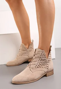 Beżowe Sznurowane Botki ze Skórzaną Wkładką Ażurową Cholewką za Kostkę i Wycięciem Tlixa