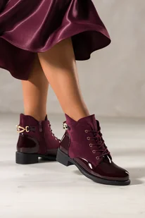 Bordowe botki damskie lakierowane na niskim klocku zamszowe wstawki złota ozdoba sznurowane Casu NW2397-6