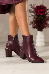 Bordowe botki damskie z gumą na ozdobnym obcasie z wzorem wężowym ze złotymi dodatkami Casu D212X10-R