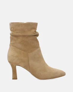 Stylowe botki damskie wykonane z miękkiego, beżowego zamszu, które doskonale łączą elegancję z modnym designem. Model posiada szpiczaste noski, które wysmuklają stopę i nadają butom kobiecego charakteru. Marszczona cholewka podkreśla nowoczesny styl i dodaje całości lekkości. Botki osadzono na stabilnej, szerokiej szpilce, która zapewnia wygodę oraz elegancki wygląd. Praktyczny suwak umieszczony z boku ułatwia zakładanie i zdejmowanie obuwia.