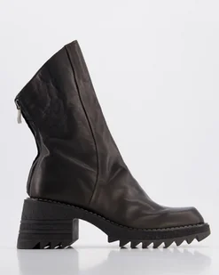 Botki damskie wykonane ze skóry cielęcej o gładkim licu. Minimalistyczna cholewka została przełamana grubą, traperową podeszwą. Stylowym dopełnieniem są usztywniane noski o modnym, kwadratowym kształcie. ozdobny otok asymetryczna cholewka kwadratowy nosek zapięcie na suwak umieszczony z tyłu skórzana wyściółka oraz wkładka wygodny, szeroki obcas