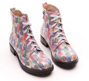 Botki Skórzane Eleganckie botki skórzane z naturalnej skóry o wzorze kolorowej kostki Niewielki obcas, nietuzinkowe, idealne do codziennej stylizacji. Buty są bardzo wygodne, idealnie dopasowują się do st ...
