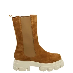 Botki z wysoką cholewką wykonane z miękkiej skóry naturalnej typu zamsz . Wzór wyposażony w dwie elastyczne wstawki ułatwiające zakładanie obuwia. Lekko usztywniany nosek zabezpieczający palce. Atutem jest modna, masywna podeszwa typu traper, która zapewni świetną izolację oraz przyczepność do podłoża. Komfort podczas noszenia zapewni wkładka z miękkiej skóry licowej.