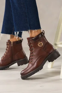 Brązowe botki damskie na bieżnikowanej podeszwie sznurowane na cholewce złota ozdoba Casu CB346-7