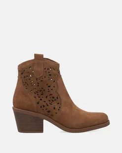 Botki damskie w brązowym kolorze, wykonane ze skóry naturalnej zamszowej, o dopracowanym, subtelnie kowbojskim charakterze. Cholewka przed kostkę została ozdobiona ażurowym motywem, który nadaje modelowi lekkości i dekoracyjnego wyrazu, jednocześnie podkreślając staranność wykończenia. Zaokrąglony nosek harmonijnie współgra ze stabilnym obcasem typu słupek o warstwowej konstrukcji, który wysmukla sylwetkę i zapewnia pewność kroku. Zamek błyskawiczny umieszczony po wewnętrznej stronie ułatwia zakładanie. Wnętrze wykończono miękką materiałową futrówką, która podnosi komfort użytkowania.