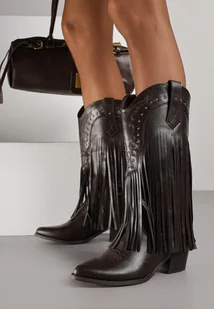Brązowe Botki Kowbojki na Obcasie Zdobione Nitami i Frędzlami Calles