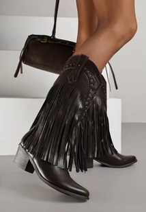 Brązowe Botki Kowbojki na Stożku z Cholewką z Ćwiekami i Frędzlami Elles