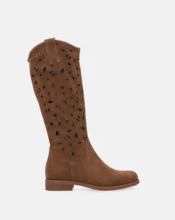 Kozaki damskie wykonane z naturalnego zamszu w ciepłym, brązowym odcieniu. Wysoka cholewka zdobiona precyzyjnym, ażurowym motywem nadaje całości lekkości i wyrazistego charakteru. Gładka dolna część subtelnie równoważy dekoracyjne wykończenie, podkreślając staranność wykonania. Klasyczna linia noska oraz niski, stabilny obcas tworzą spójną, ponadczasową formę. Model sprawdzi się jako stylowe uzupełnienie codziennych i bardziej dopracowanych stylizacji.