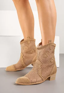 Ciemnobeżowe Ażurowe Botki w Stylu Kowbojek na Stożku ze Skórzaną Wkładką Xalozi