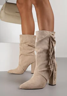 Ciemnobeżowe Botki Kowbojki na Słupku z Frędzlami Reisetia