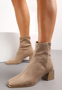 Ciemnobeżowe Botki na Słupku z Kwadratowym Noskiem Jozelinetta