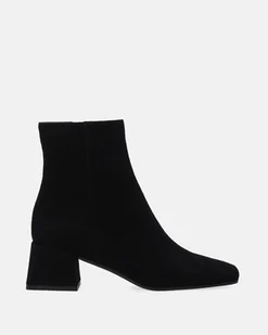 Damskie botki premium wykonane z eleganckiego, miękkiego zamszu w klasycznej czerni to ponadczasowy wybór w nowoczesnym wydaniu. Krótka, gładka cholewka zapinana na suwak gwarantuje komfort zakładania, a kwadratowe noski podkreślają modny i minimalistyczny charakter butów. Uniwersalne i stylowe - doskonale sprawdzą się zarówno w codziennych, jak i wieczorowych stylizacjach. szeroki obcas oblekany skórą zamszowa cholewka za kostkę zapięcie na suwak z boku wyściółka ze skóry licowej kwadratowe noski