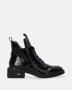 Damskie botki wykonane z lakierowanej skóry naturalnej w klasycznej czerni. Wydłużona cholewka z eleganckim sznurowaniem subtelnie wydłuża sylwetkę, a połyskujące wykończenie skóry dodaje całości wyrazistości i szykownego charakteru. Stabilny, niski obcas został ozdobiony metaliczną wstawką, przełamując minimalistyczną formę i nadając obuwiu nowoczesnego akcentu. Starannie wykończony model łączy komfort codziennego użytkowania z elegancją, doskonale sprawdzając się zarówno w codziennych, jak i w wieczorowych zestawieniach. naturalna skóra lakierowana klasyczne sznurowanie okrągłe noski wnętrze