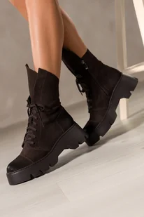 Czekoladowe botki skórzane damskie workery na bieżnikowanej platformie geometrycznie wycięta cholewka sznurowane PRODUKT POLSKI Casu 023
