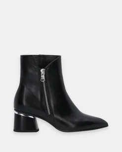 Czarne botki wykonane z wysokiej jakości skóry bydlęcej. Elegancki model z pięknie wyciętą cholewką osadzony na malowanym obcasie ze srebrnym wykończeniem. Model sprawdzi się jako baza do wielu jesienno-zimowych stylizacji. wkładka i futrówka ocieplone polarem zapięcie na suwak nosek w szpic gładka skóra stabilny, malowany obcas