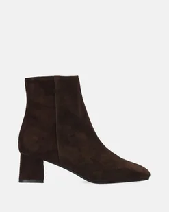 Botki damskie wykonane z wysokiej jakości naturalnego zamszu w odcieniu ciemnego brązu. Prosty fason z kwadratowym noskiem i szerokim, stabilnym obcasem nadaje im elegancki charakter. Model zapinany na suwak z boku, z gładką, jednolitą cholewką bez przeszyć. Świetnie sprawdzą się zarówno w stylizacjach codziennych, jak i bardziej eleganckich. naturalny zamsz gruby, stabilny obcas kwadratowe noski zamek po wewnętrznej stronie klasyczny krój